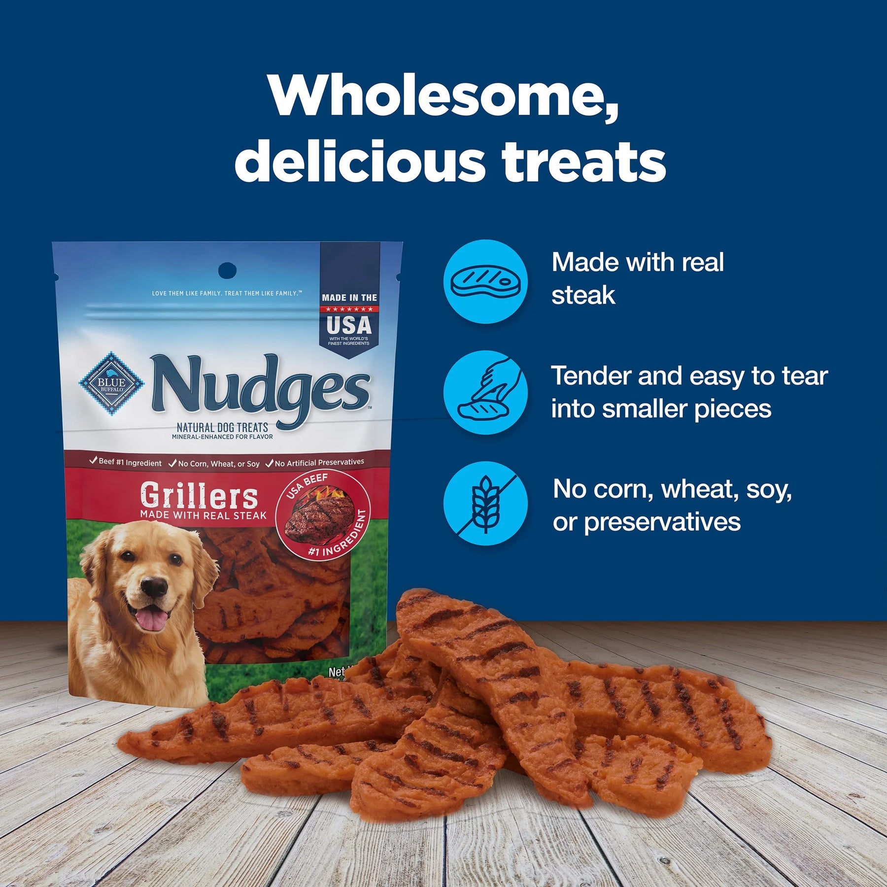Give your dog the taste of real chicken and duck with BLUE Nudges Premium Jerky Cuts Natural Dog Treats. Made with real USA chicken as the first ingredient, these tender dog treats are easy to tear into smaller pieces, so they're great for dogs of all breed sizes and ages. And like all Blue Buffalo dog treats, these treats for dogs never contain chicken (or poultry) by-product meals, corn, wheat, soy, artificial flavors, or preservatives. Watch their tail wag when you reward them with BLUE Nudges Premium Jerky Cuts Chicken & Duck Dog Treats.