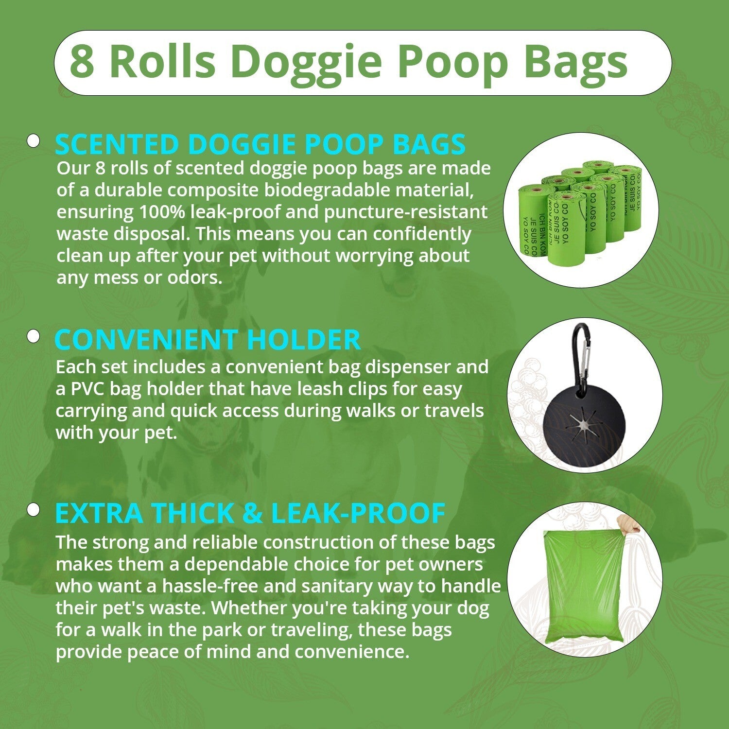 With 8 rolls per box, you’ll have a continuous supply of high-quality, biodegradable poop bags for dogs. Whether you're out for a walk, at the park, or cleaning up at home, these bags make dog waste cleanup simple and sustainable.